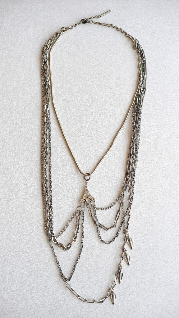 Multiple strands of assorted silver chain fall elegantly from a vintage crystal drop. Hanging off a snake chain these layers loop in an asymmetric yet balanced rhythm reminiscent of a graceful chandelier in a grand ballroom or the beautiful looping pattern of a spider's web. The web of chain is further adorned with small arrow-head drops along one side.