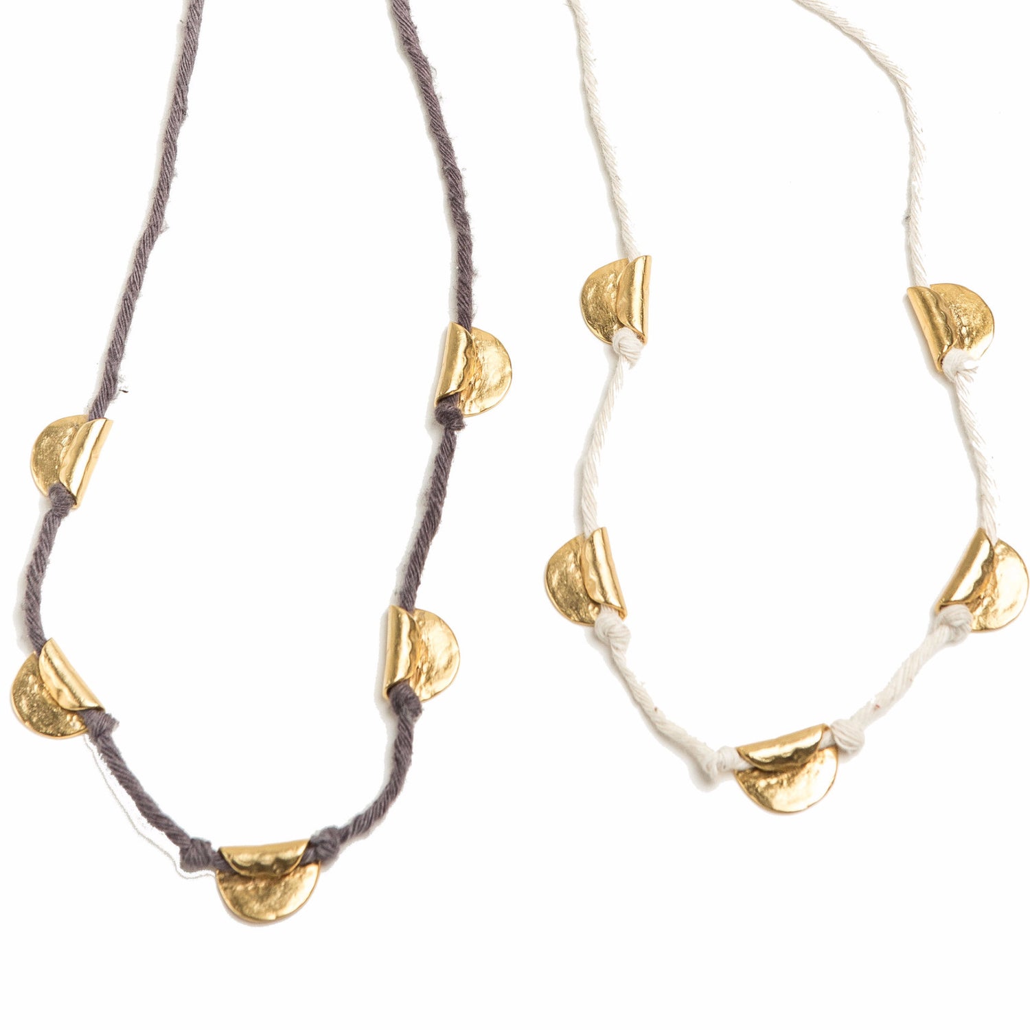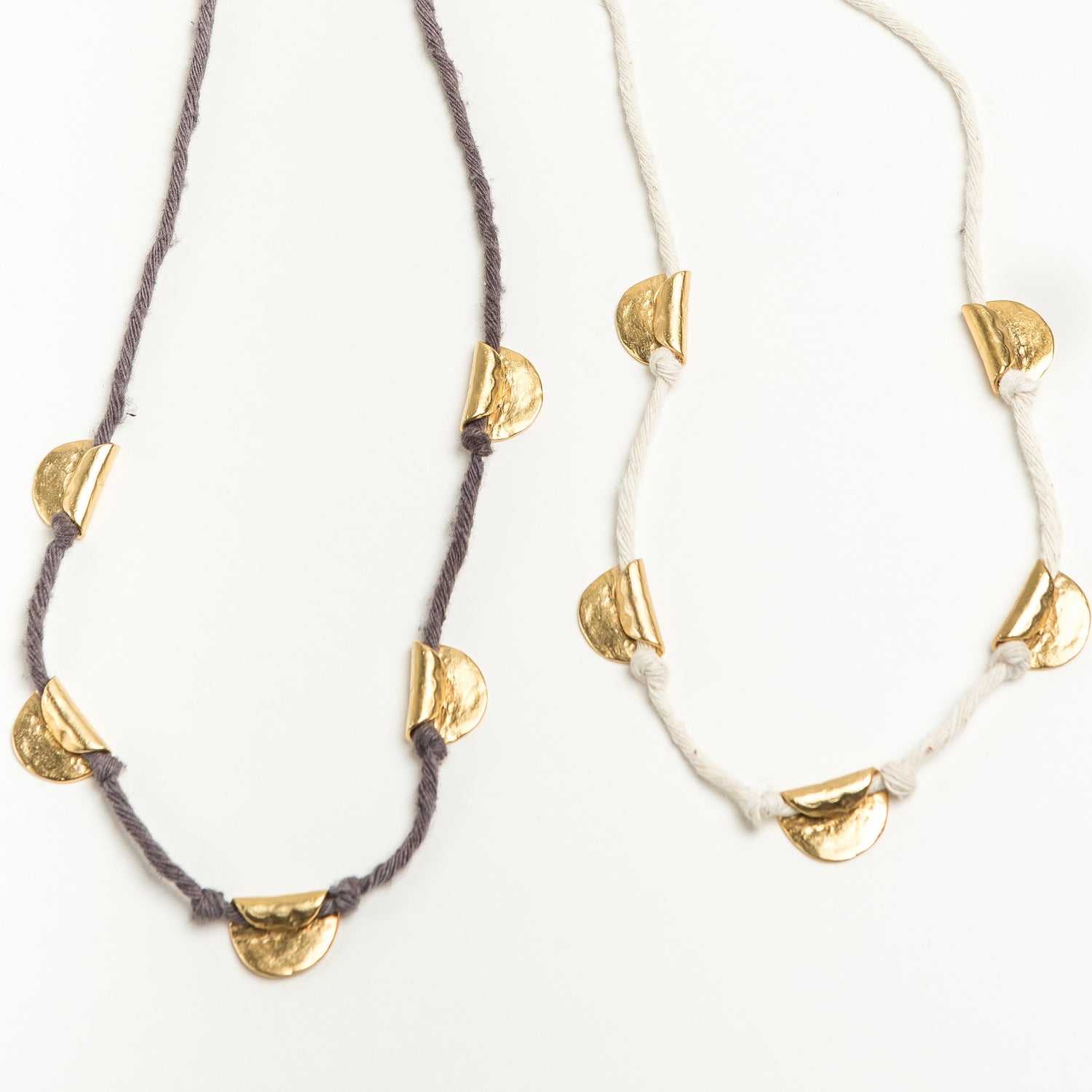 Hand fabricated gold plated pendants on a hand dip-dyed cotton cord.