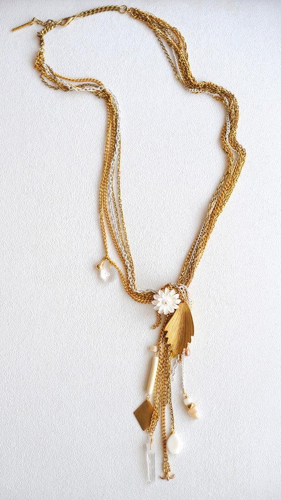 Long strands of gold and white-enameled chain meet in an elegant knot bursting with a tassels and adorned with a whimsical cluster of unique charms and vintage finds; crystals, beads and shell fall in harmonious shades of ivory, white and gold.