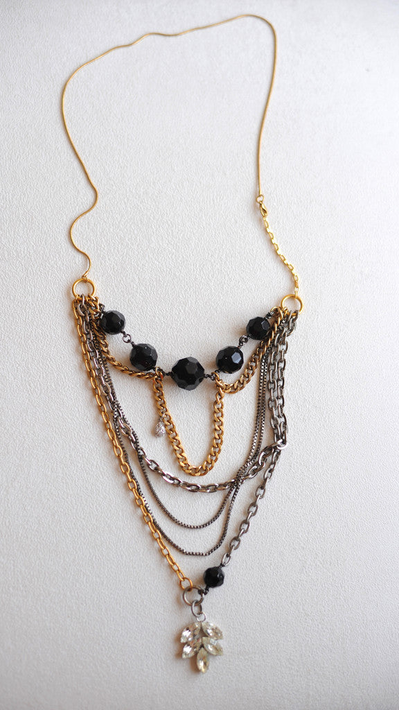 Gold curb chain hangs in three balanced drops between five faceted black glass beads. Strands of box and cable chain add texture and frame a vintage crystal leaf detail dropping from the bottom.
