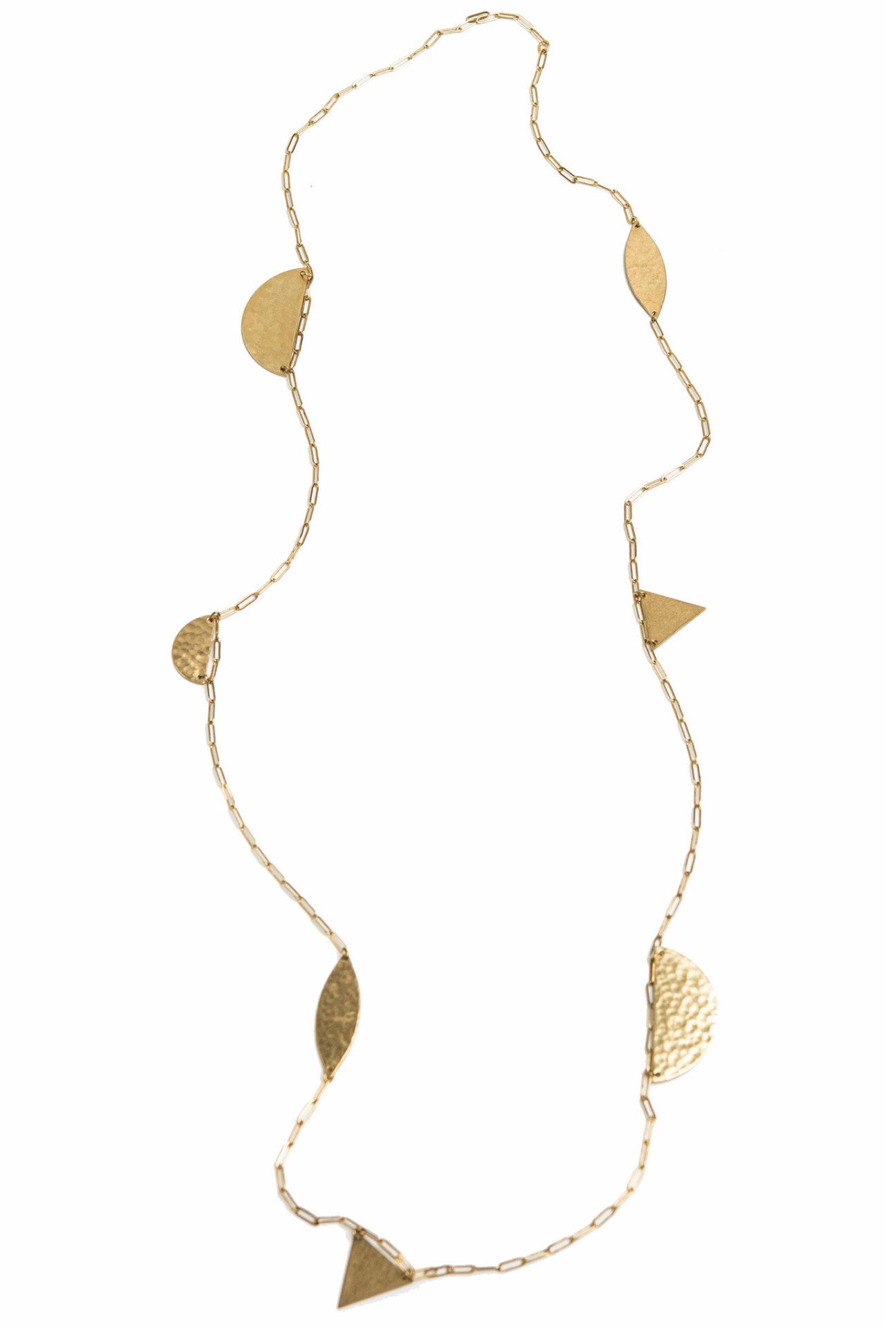 An assortment of brass geometric shapes hang together on delicate gold plated chain. Light-weight, versatile, asymmetric elegance