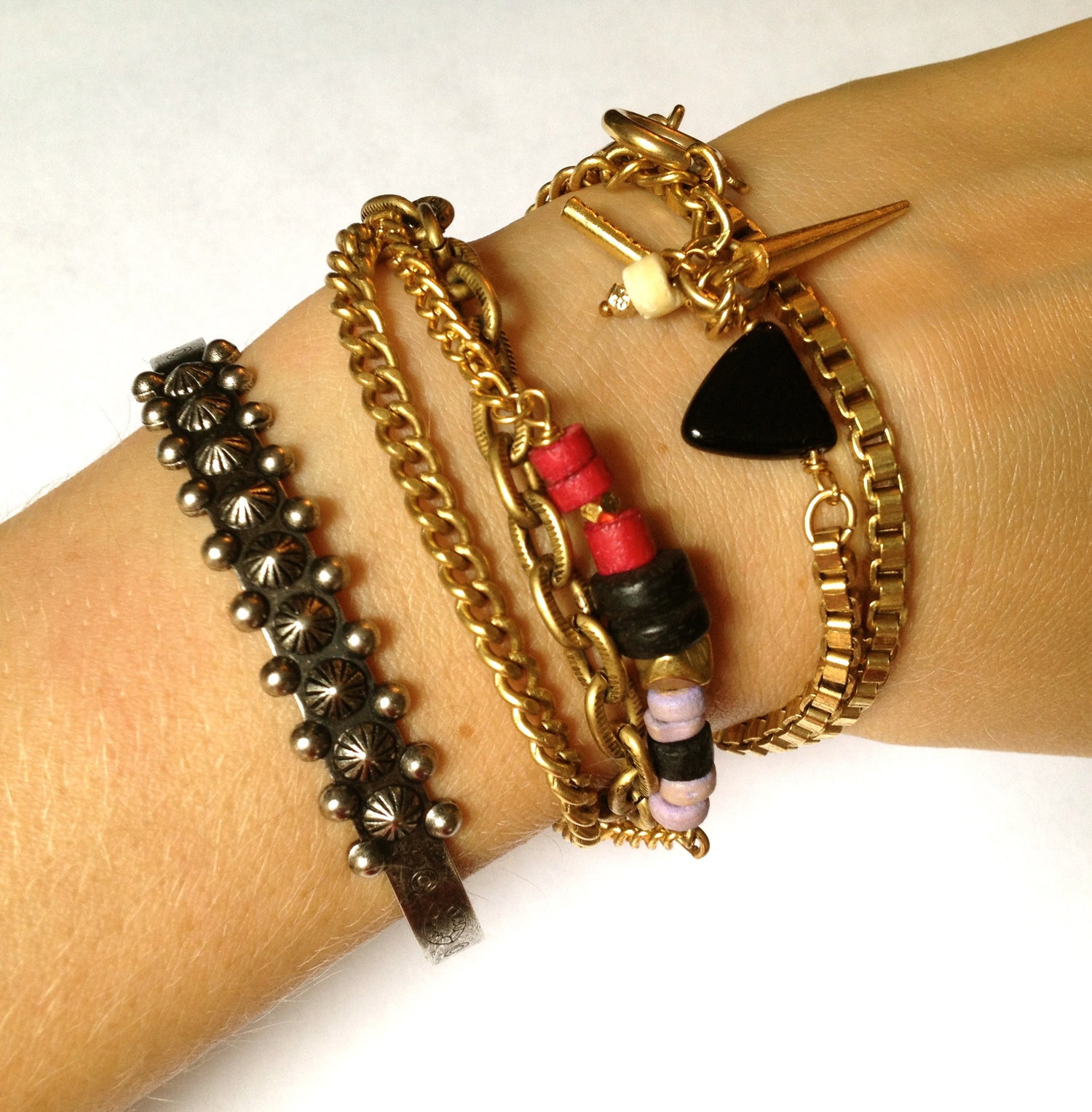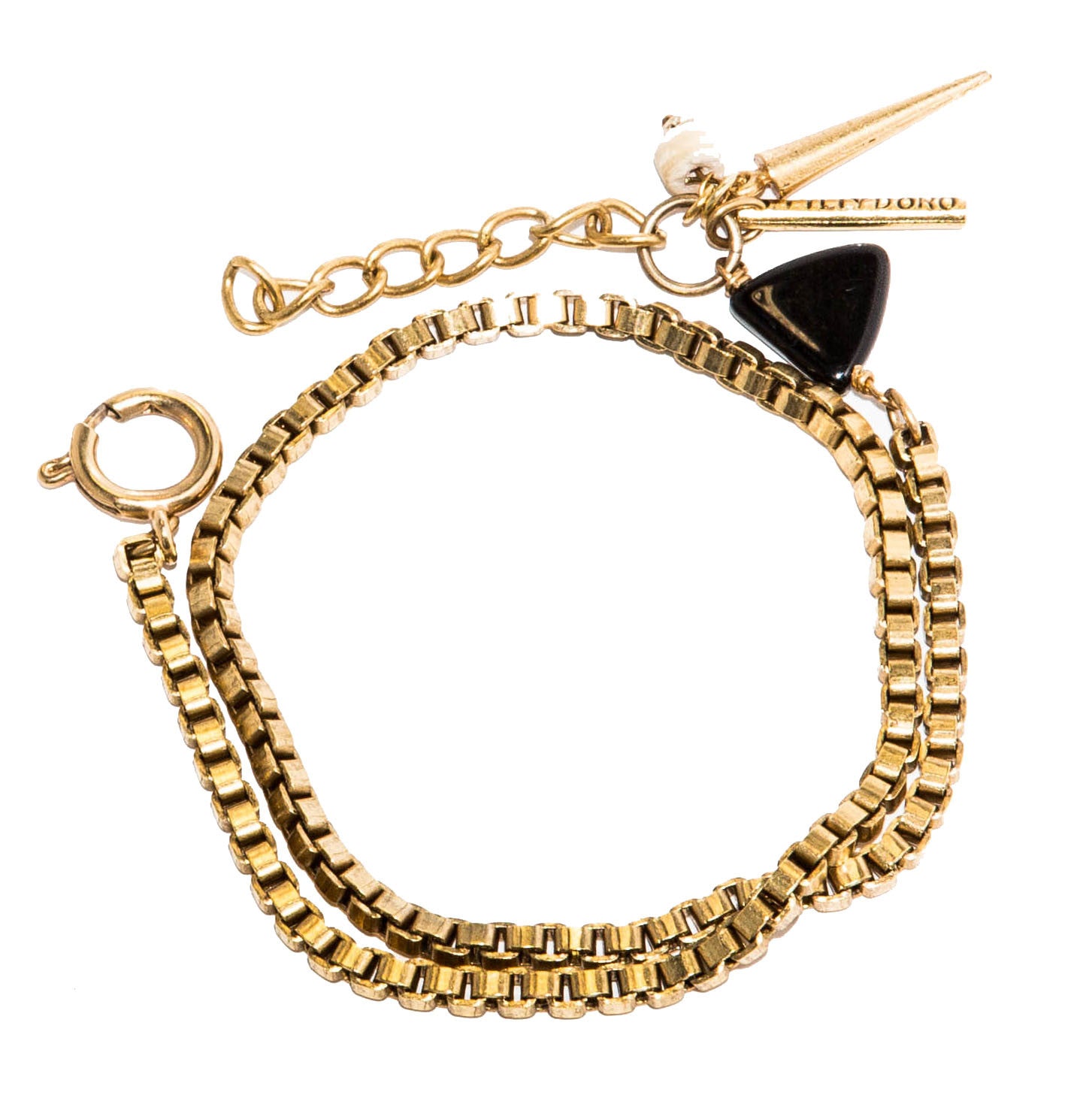 Wrapped box chain meets a cluster of small colorful charms; Black glass triangle bead, cream coco bead and gold spike.