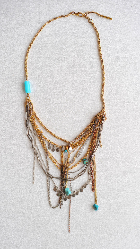 An eclectic mix of chain in gold, silver and copper come together in this special piece. Tiny round tokens hang with turquoise stone chips and an electric blue vintage bead. The intricate tangle of fine chain and bright pops of color evoke the adornments of a wandering gypsy- collecting charms and stories to weave into her colorful flowing journey.