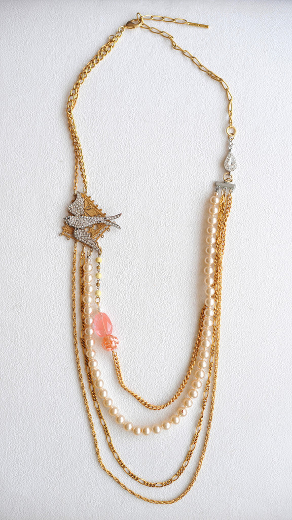 Long elegant gold chains hang with vintage treasures; faux pearls, pink quartz stone, wooden yellow rosary and splashed pink bead. Above this melange hangs a vintage sparrow adorned with tiny crystals atop a filigree charm.