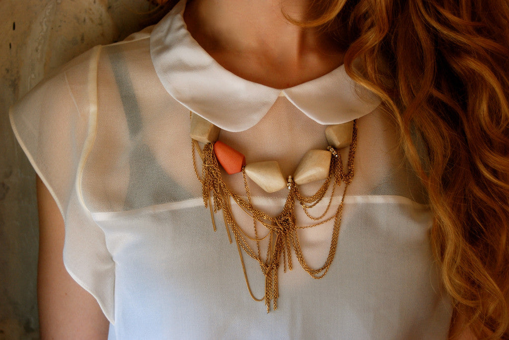 Ivory and peach-toned geometric wooden beads are strung with an elegant tangle of delicate gold chains and Swarovski crystal rondelles.