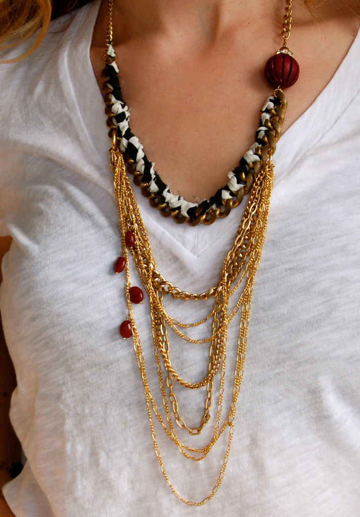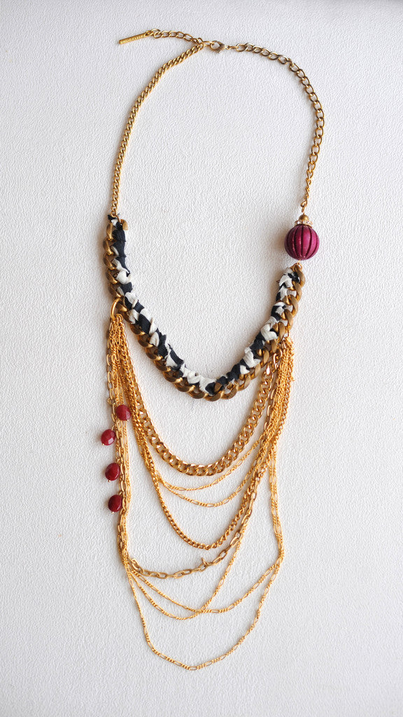This bold piece is composed of vintage black and white striped fabric woven through heavy curb chain with a wooden bead and crystal rondelle. It hangs with a wild mix of brass and gold-plated chain and drops of ruby-toned stones.