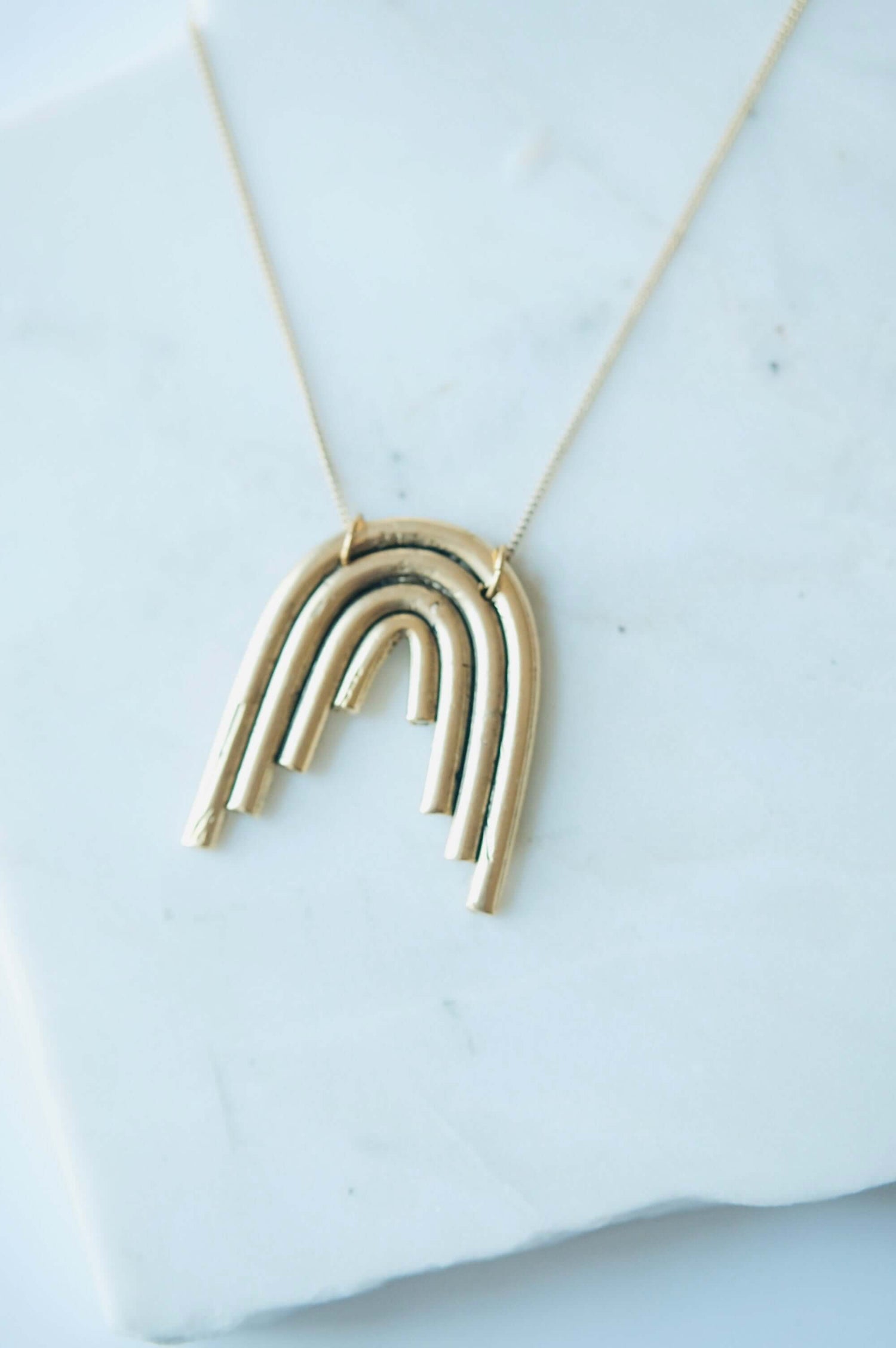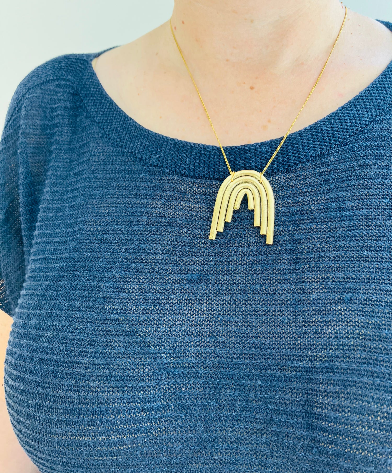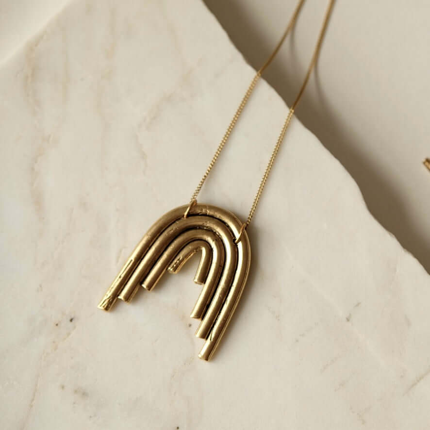 A textured rainbow hangs from elegant chain. A modern representation of a classic