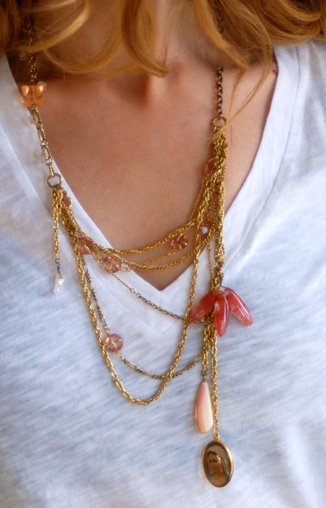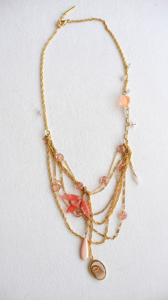 An elegant web of gold chains linked with transparent pale blush glass beads, rose quartz chips, a trinity of tear-drop stones, shell and a unique vintage religious amulet depicting the Virgin Mary on one side and the Vatican on the reverse.
