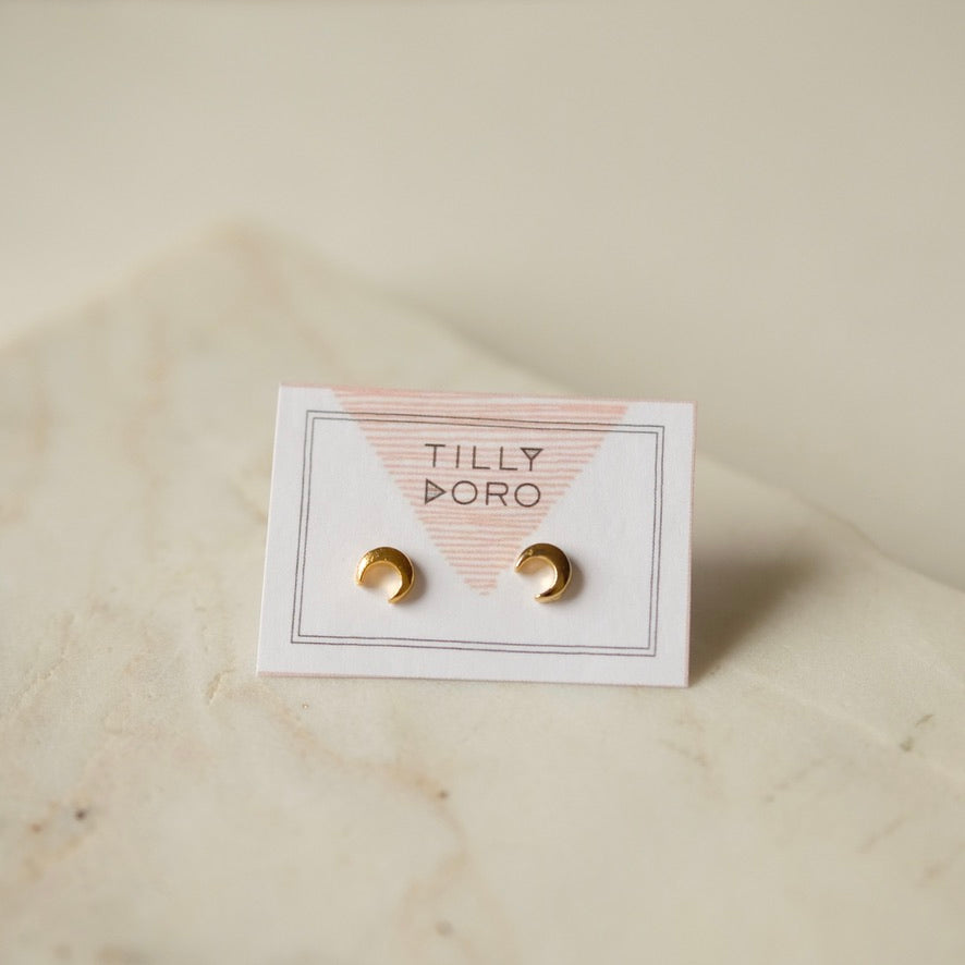 A shimmering little slice of the night sky, hand fabricated small crescent moon stud earrings