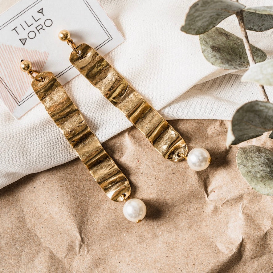 A best- seller, the Wave and Pearl earrings feature a delicate faux pearl hanging on the tip of a wavy gold bar.