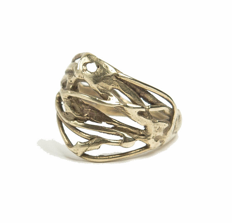 Organic shape with open spaces and thin wisps of metal intertwined- a definite statement piece.